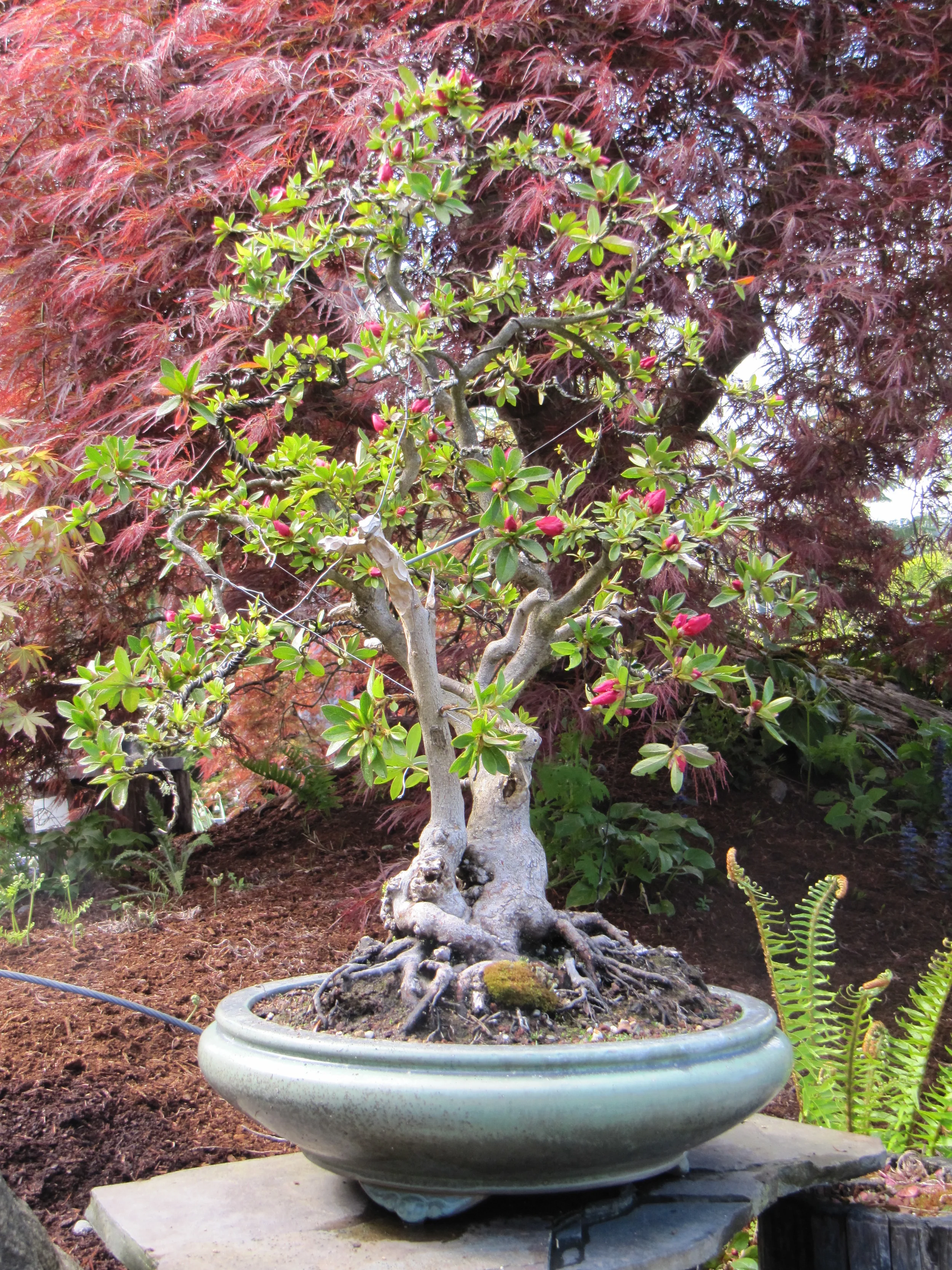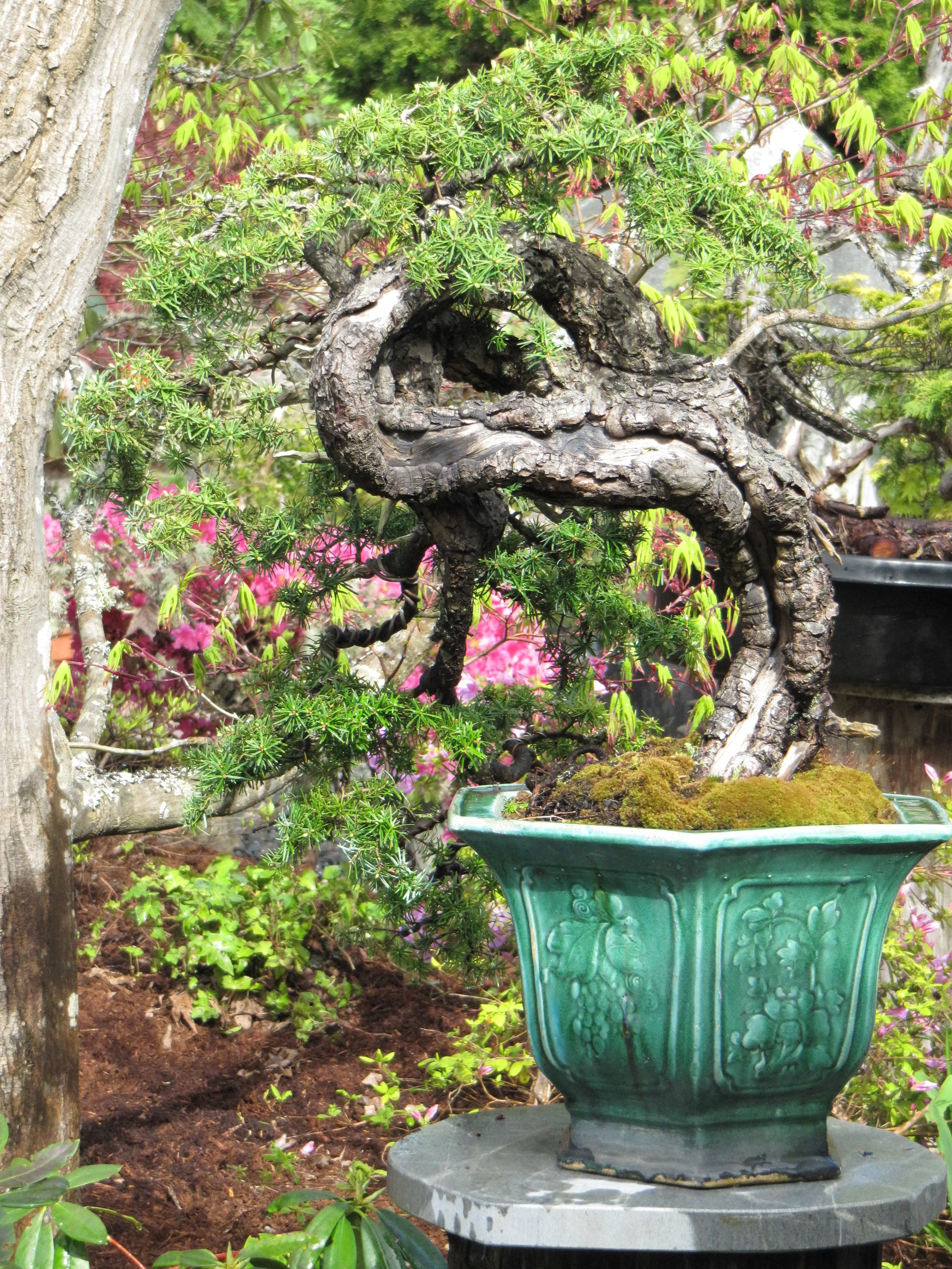 Bonsai (pronounced bone-sigh) is an ancient oriental horticultural art form. The word Bonsai literally means, in both Chinese and in the Japanese language, tree-in- a-pot. Originally developed in the Orient almost 2000 years ago, the sublime art of bonsai is now practiced throughout the world. Shape, harmony, proportion and scale are all weighed carefully. The human hand, in collaboration with nature, combines these elements to create a living work of art.